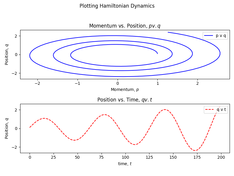 Now, look at the equations above. This is the core beauty of Hamiltonian mechanics. The change in \(q\) through time is dependent on \(p\) and the change in \(p\) is dependent on \(q\).
